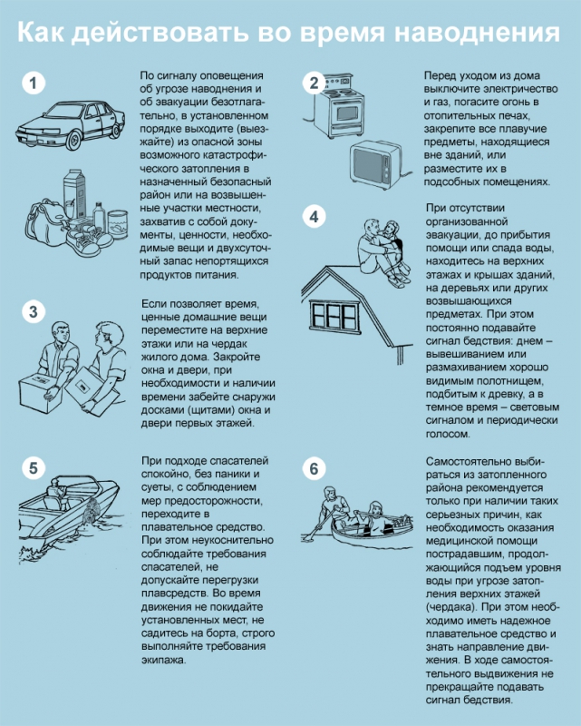 Быстро соберите необходимые документы, ценности, лекарства, продукты и прочие необходимые вещи. Окажите помощь детям, инвалидам и людям преклонного возраста. Они подлежат эвакуации в первую очередь. По возможности немедленно оставьте зону затопления. Перед выходом из дома отключите электро- и газоснабжение, погасите огонь в печах. Закройте окна и двери, если есть время - закройте окна и двери первого этажа досками (щитами). Выпустите домашний скот. Поднимитесь на верхние этажи. Если дом одноэтажный - займите чердачные помещения. До прибытия помощи оставайтесь на верхних этажах, крышах, деревьях или других возвышениях, сигнализируйте спасателям, чтобы они имели возможность быстро вас обнаружить. Для самоэвакуации используйте лодки, катера, плоты из бревен и других подручных материалов. Не следует передвигаться в автомобиле, на мотоцикле, бушующий поток воды способен их опрокинуть. Оказавшись в воде, снимите с себя тяжёлую одежду и обувь, отыщите вблизи предметов, которыми можно воспользоваться до получения помощи. После спада воды остерегайтесь порванных и провисших электрических проводов. Категорически запрещается использовать продукты питания, попавшие в воду, и употреблять воду без соответствующей санитарной проверки. Перед входом в жилище после спада воды соблюдайте меры предосторожности: предварительно откройте двери и окна для проветривания, не пользуйтесь открытым огнем до проветривания (возможна взрывопожароопасная концентрация газов), запрещается включать осветительные и другие электроприборы до проверки исправности электрических сетей.